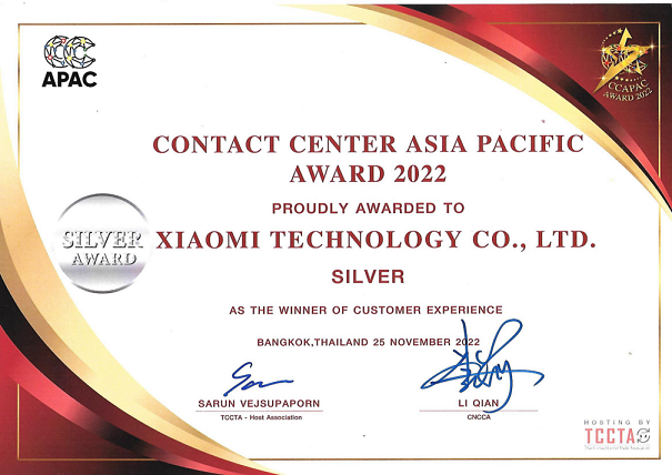 小米通訊技術(shù)有限公司榮獲2022年度亞太客戶中心客戶體驗(yàn)管理大獎(jiǎng)-銀獎(jiǎng)。
